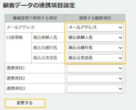 - 債権管理への連携の「連携する」を選択し、それぞれの請求情報に該当する帳票項目を選択し「変更する」をクリックします。