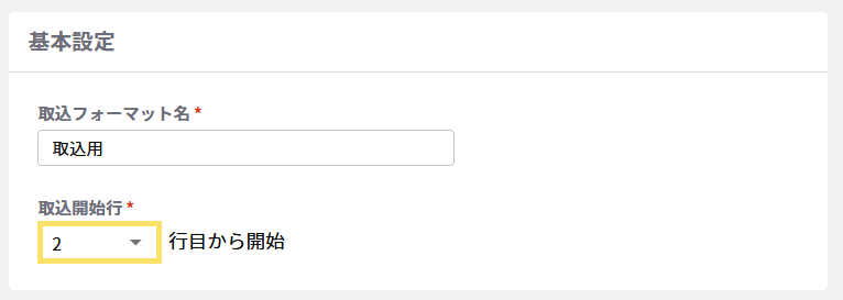 例)CSVの1行目には項目名が入っている場合、取込開始行を2行目から開始に設定