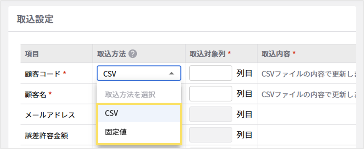 2. 取込方法をCSVにする場合は、CSVファイル内のどの列の値を取り込むか「取込対象列」に入力します。取込方法を固定値にする場合は、固定で反映させたい値を入力します。