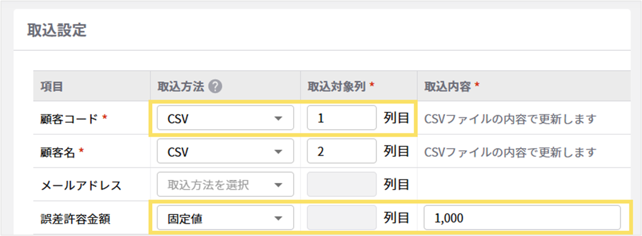 顧客ごとに、入金データと請求データを照合する際の金額誤差をどこまで許容するかの設定を行うことができます。
