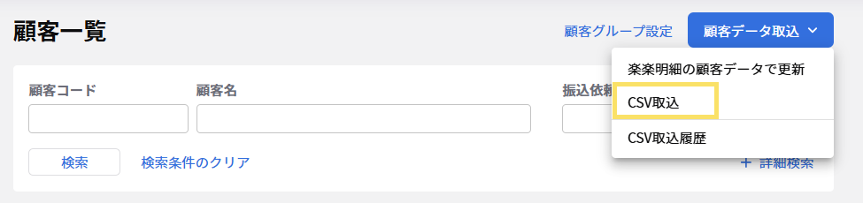 - 右上の「顧客データ取込」から、CSV取込をクリックします。