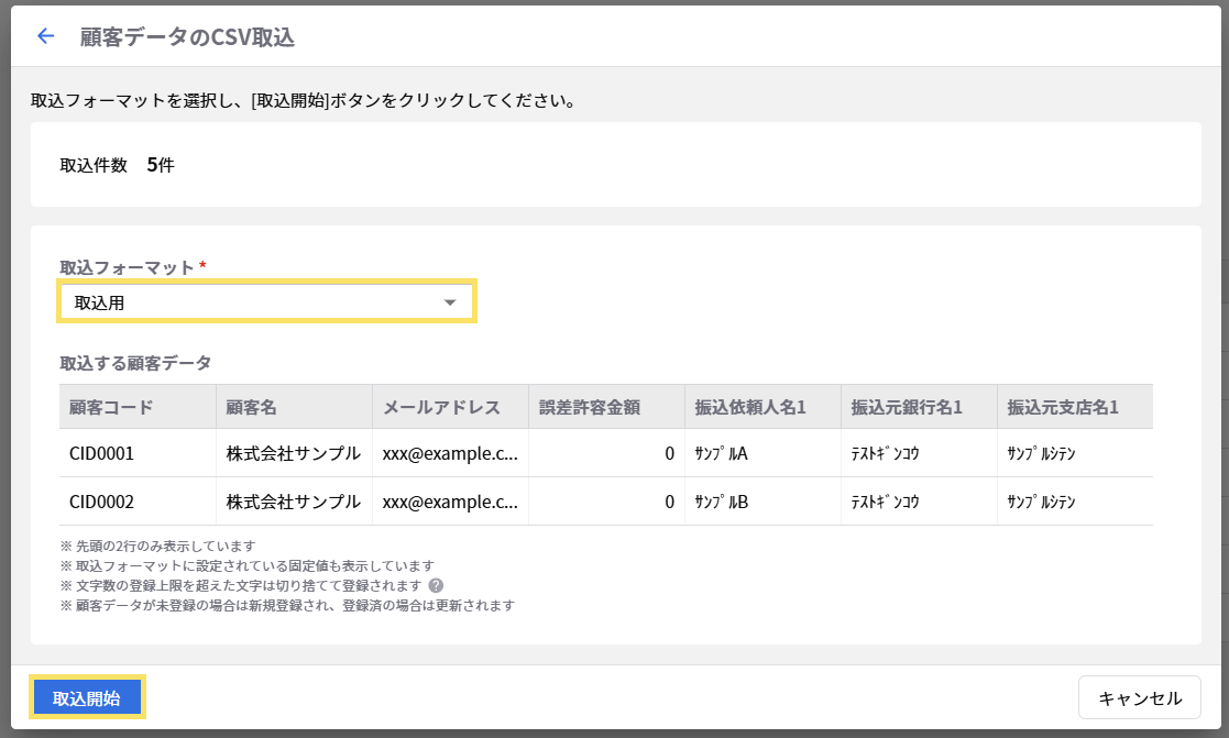 - 取込フォーマットを選択し、表示されるプレビュー内容に問題がなければ「取込開始」をクリックします。