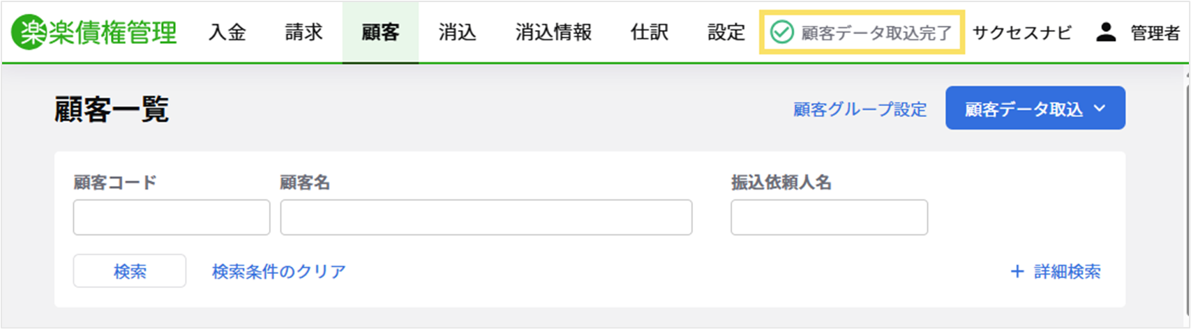 右上に「顧客データ取込完了」と表示されたら取込完了です。