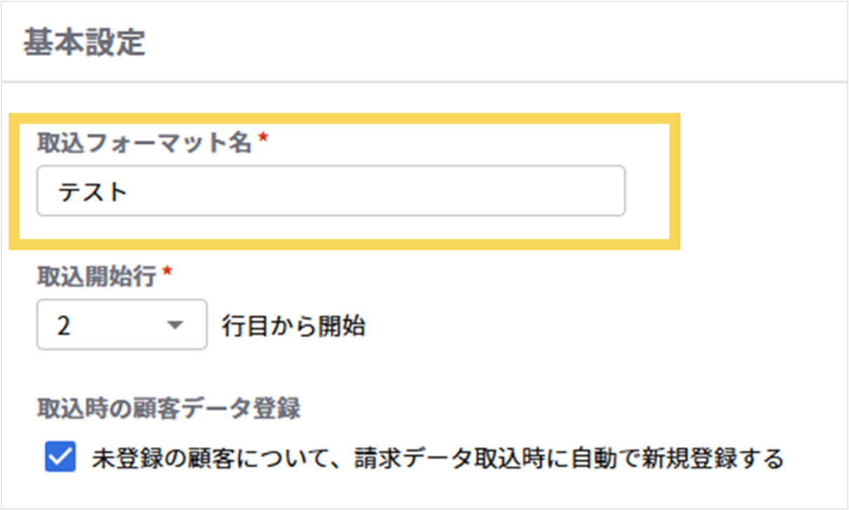 Excelや販管システムで管理されているデータを取込される場合は、「○○システム請求データ取込用」など分かりやすいフォーマット名を入力ください。