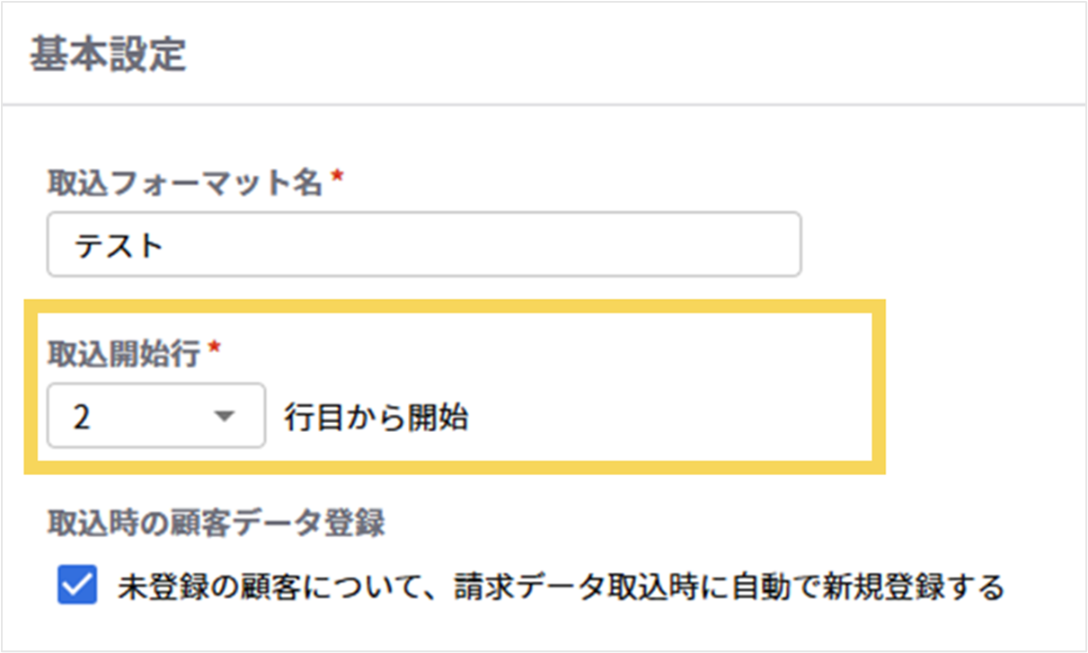 ※「未登録の顧客について、請求データ取込時に自動で新規登録する」にチェックが入っている場合は、顧客名の取込も必須になります。