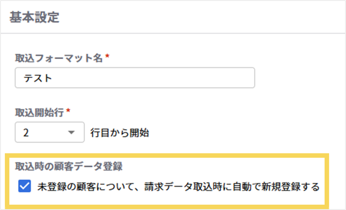 請求データ取込時に、CSV内に未登録の顧客データが含まれていた場合、合わせて顧客データを登録したい場合はチェックを入れます。