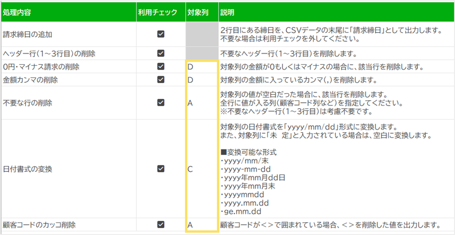変換したい請求データの対象列を入力します。