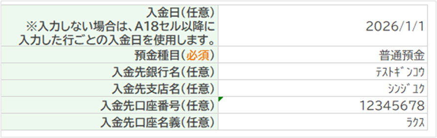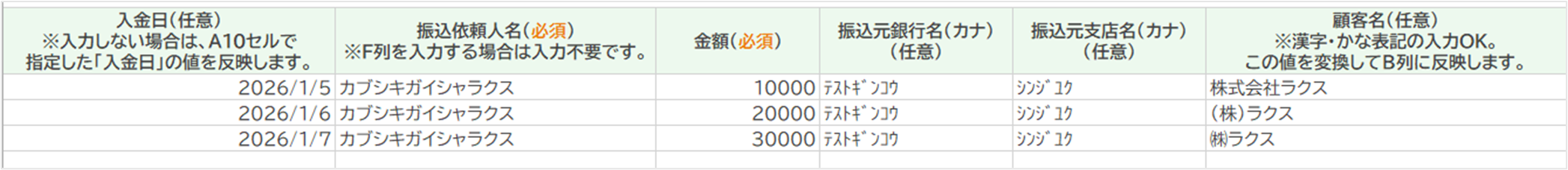 入力しない場合、A10セルに入力した「入金日」の値を反映します。振込依頼人名 カタカナの振込依頼人名がある場合は、入力します。 金額 入金額を入力します。 振込元銀行名 振込元銀行名をカナで入力します。 振込元支店名 振込元支店名をカナで入力します。 顧客名 カタカナの振込依頼人名がない場合に利用します。