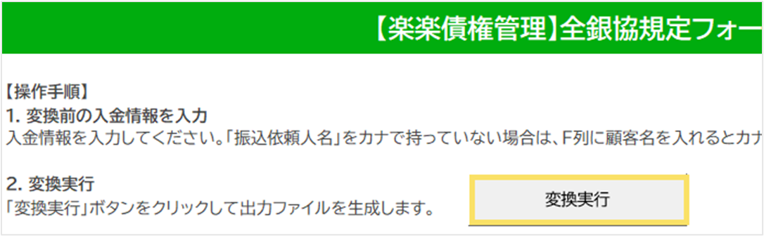 本ツールは、入金データをExcel上に入力し「楽楽債権管理」に取込可能な形式に