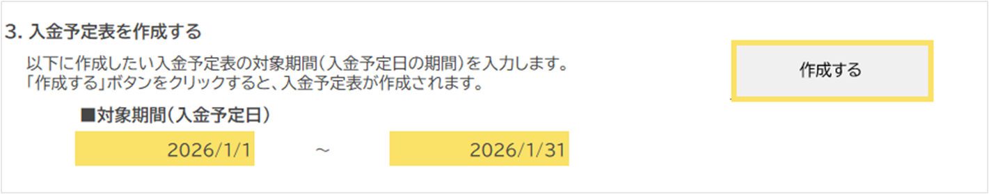 - 入金予定表を作成したい期間を入力し、「作成する」ボタンをクリックします。