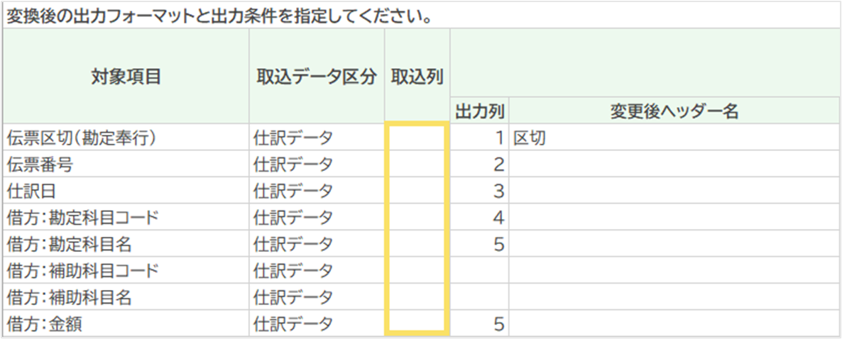- 「楽楽債権管理」 から出力した仕訳データを変換したい場合は、出力した仕訳データの項目に対応する出力列を「取込列」に数字で指定してください。