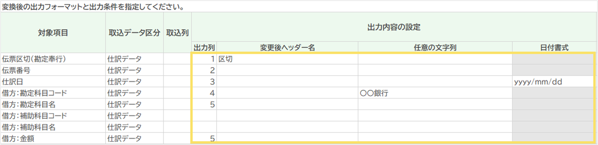 - 変換後のデータの「出力列」「変更後ヘッダー名」「任意の文字列」「日付書式」を指定します。