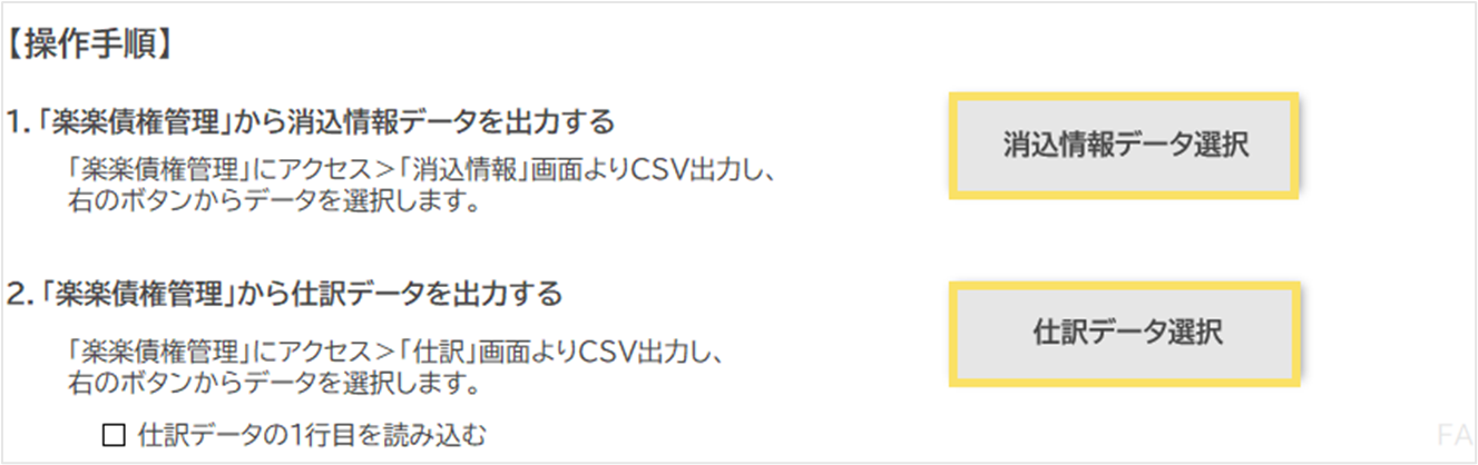 - 「消込情報データ選択」「仕訳データ」ボタンをクリックし、1と2で出力したデータを選択します。