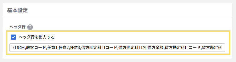 2. 出力ファイルの先頭行に任意のデータを設けたいときは、「ヘッダ行を出力する」にチェックをつけ、設定したい値を入力してください。