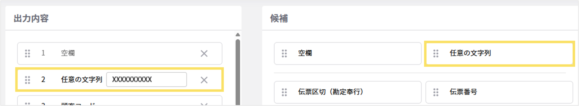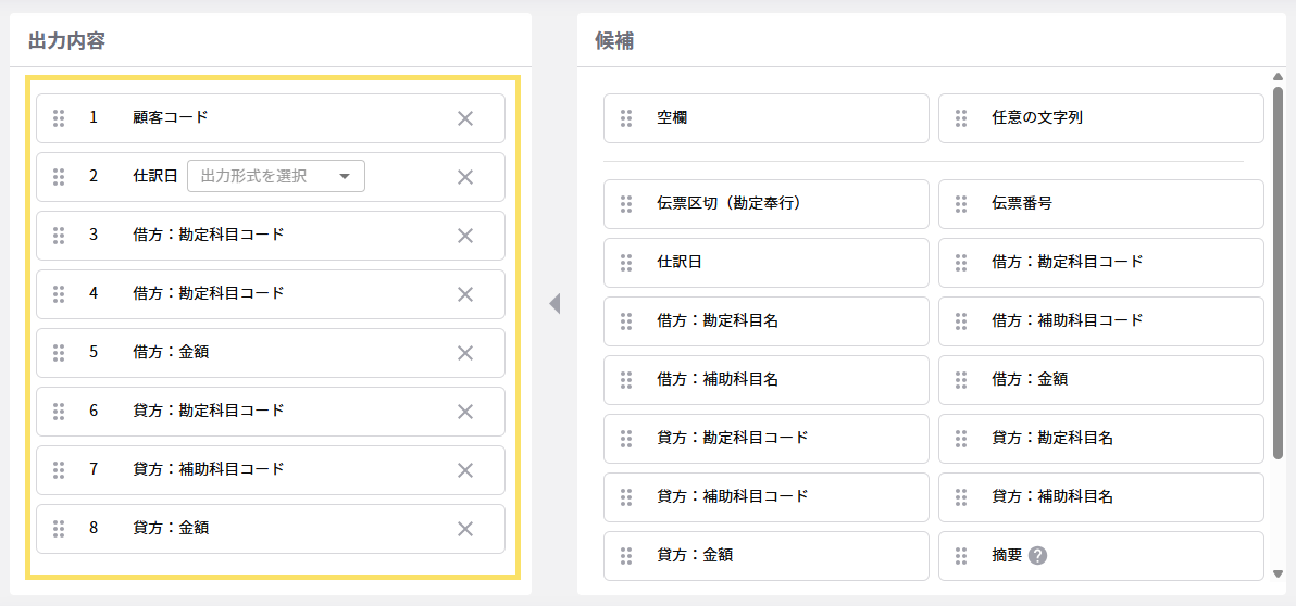 3. 出力したいフォーマットに合わせて、項目の追加や並び替えをします。