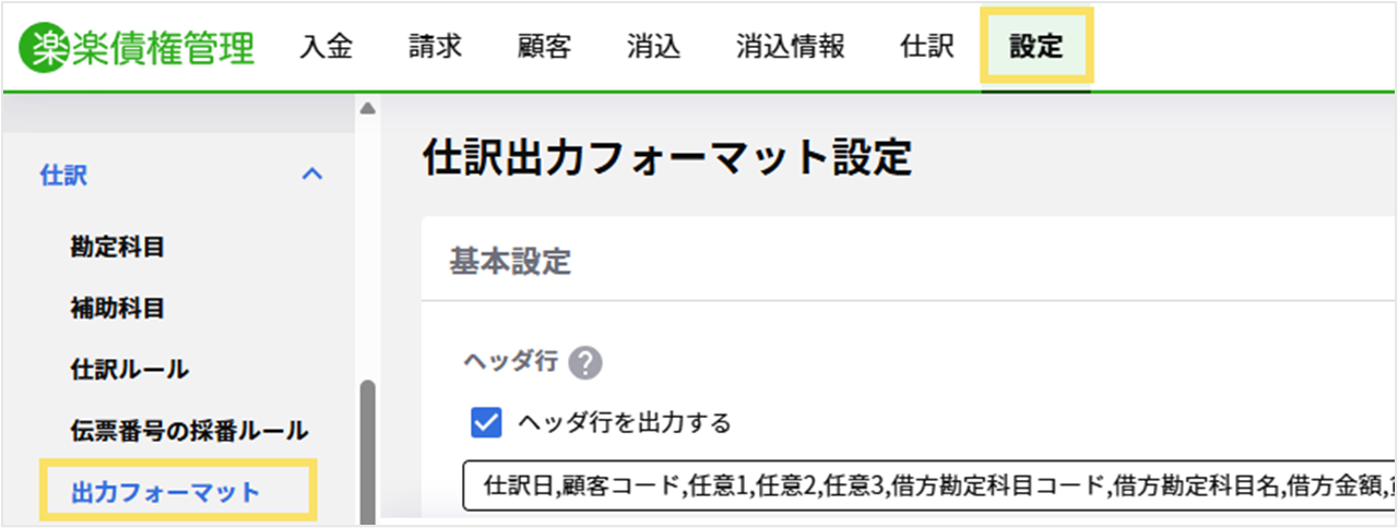 1. 債権管理>「設定」タブ>「仕訳データ出力設定」をクリックします。