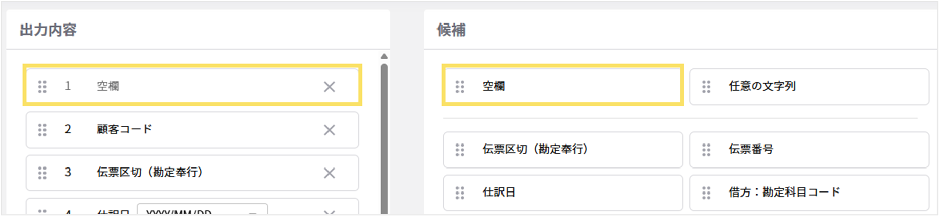 出力するデータ上に値を出力しない列を作成したい場合は、「空欄」を設定すると値を出力しない列が追加されます。