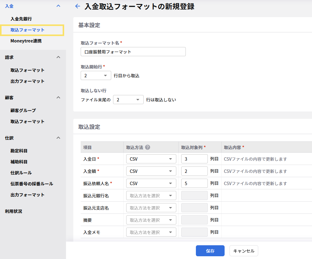 「設定」画面より、入金の取込フォーマットが設定可能になります。