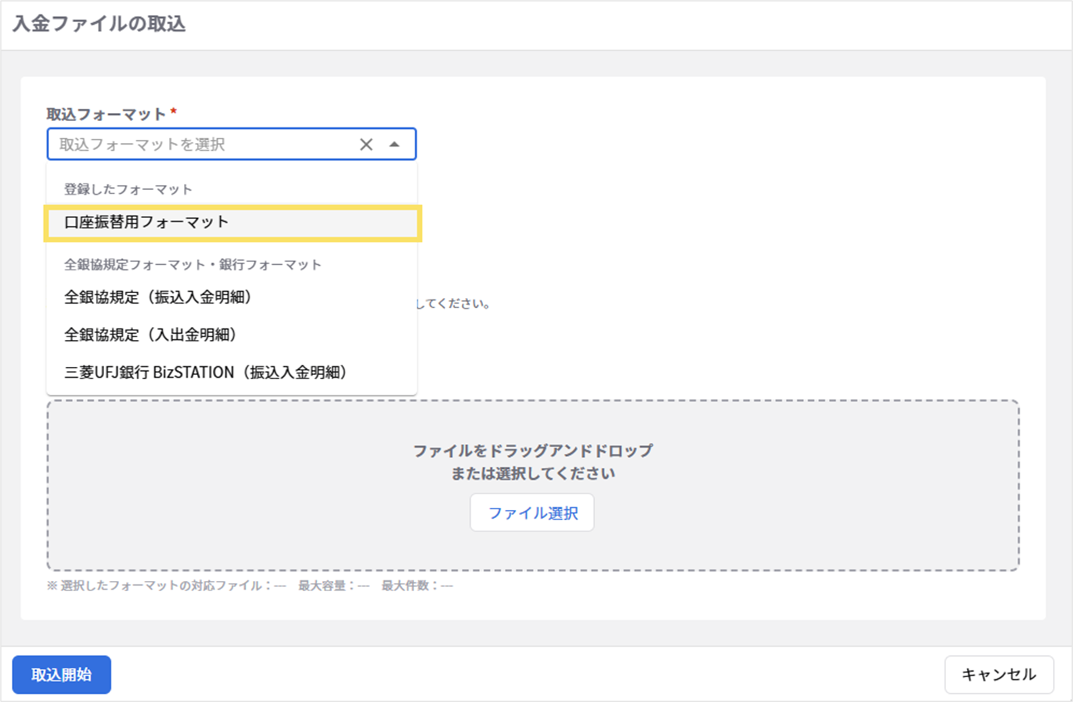 「入金」>入金ファイル取込 画面より、設定したフォーマットが選択可能になります。