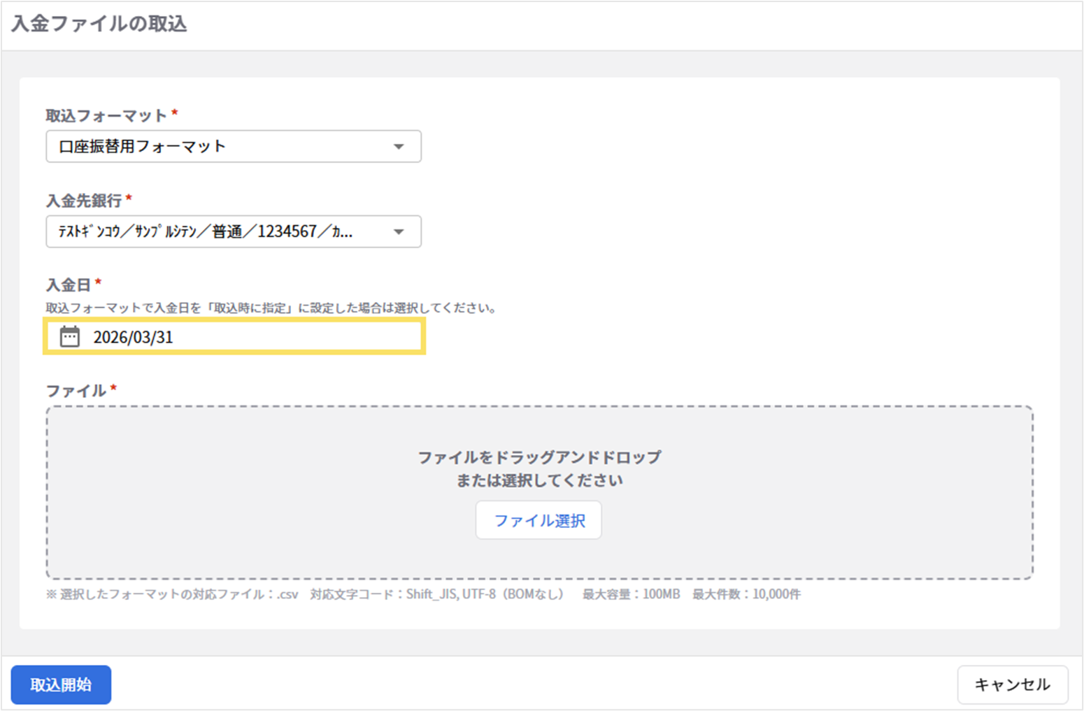 「入金」画面にて、貴社で設定した任意フォーマットの入金データが取込可能になります。